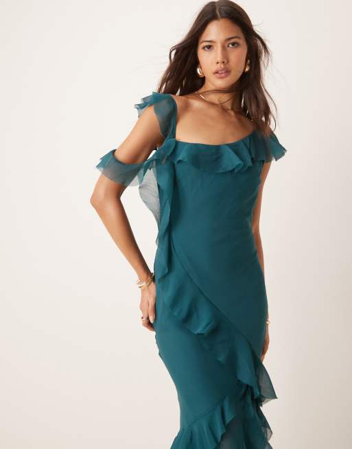 ASOS DESIGN – Ciemnozielona cięta ze skosu niesymetryczna sukienka maxi z falbankami