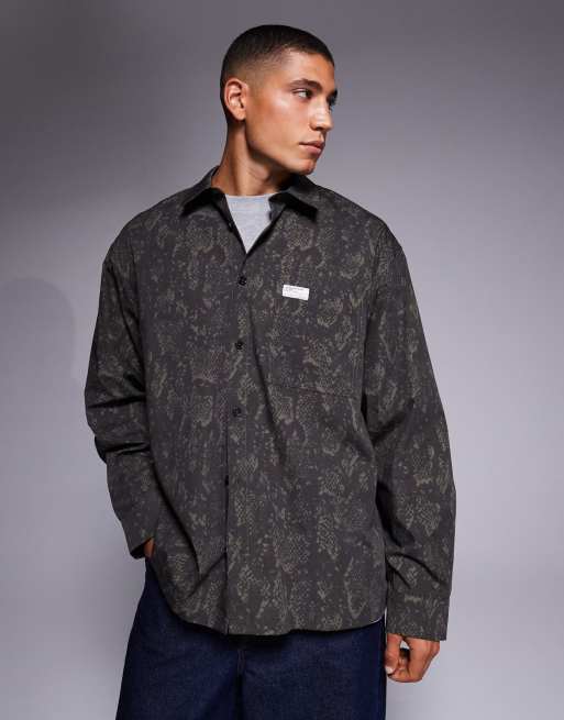 ASOS DESIGN – Ciemnozielona koszula oversize w wężowy wzór z naszywką na piersi