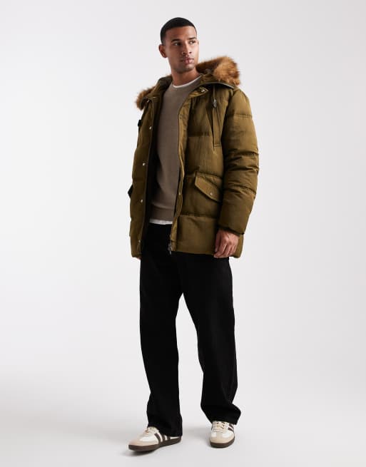 ASOS DESIGN – Ciemnozielona ocieplana kurtka z kapturem wykończonym sztucznym futrem