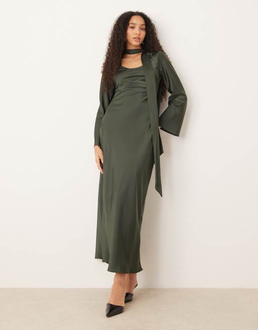 ASOS DESIGN – Ciemnozielona sukienka maxi z dekoltem V, szaliczkiem i długimi rękawami