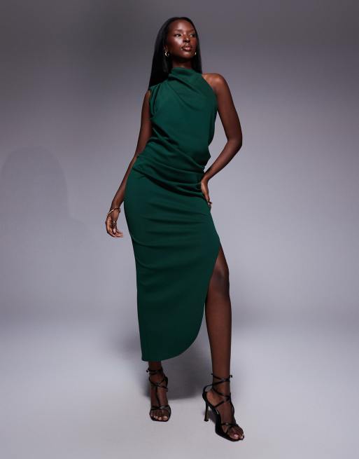 ASOS DESIGN – Ciemnozielona sukienka midi na jedno ramię z materiału w stylu scuba