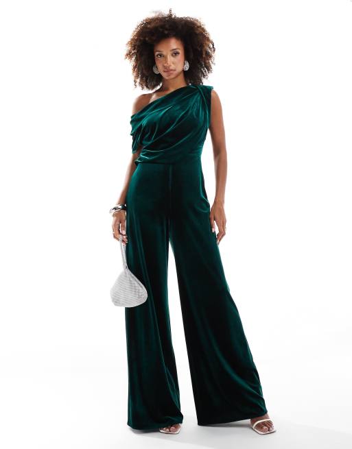 ASOS DESIGN – Ciemnozielony aksamitny kombinezon z opadającymi ramionami, szerokimi nogawkami i zaszewkami