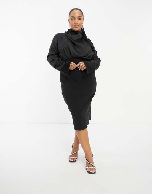 ASOS DESIGN Curve – Czarna satynowa sukienka midi z zabudowanym dekoltem i spódnicą