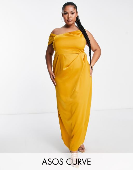 ASOS DESIGN Curve – Złota satynowa sukienka maxi na jedno ramię z zakładkami