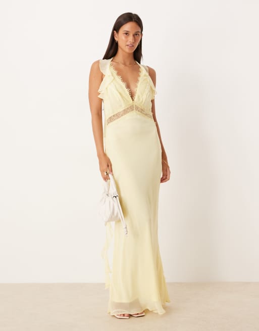 ASOS DESIGN – Cytrynowa szyfonowa sukienka midi na ramiączkach z koronkową wstawką