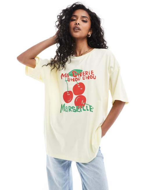 ASOS DESIGN – Cytrynowy T-shirt oversize z grafiką z wiśniami