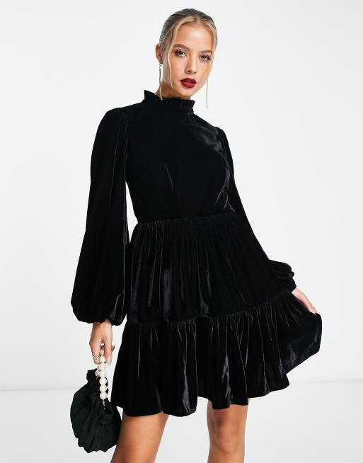 ASOS DESIGN – Czarna aksamitna luźna sukienka mini z wysokim marszczonym dekoltem i kieszeniami