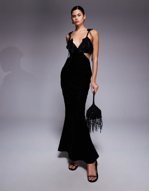ASOS DESIGN – Czarna, aksamitna sukienka maxi z wycięciem i zdobieniem na biuście