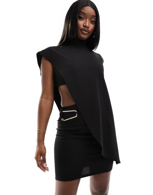 ASOS DESIGN – Czarna asymetryczna sukienka mini z drapowaniem, zabudowanym dekoltem i złotym wykończeniem