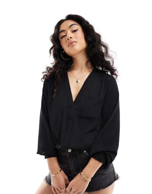 ASOS DESIGN – Czarna bluzka z długim rękawem i ozdobną kieszonką