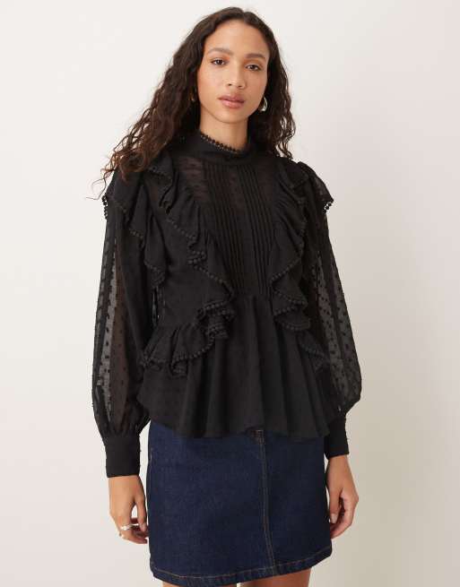 ASOS DESIGN – Czarna bluzka z długimi rękawami, falbankami i haftowanym wzorem
