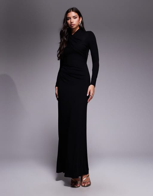 ASOS DESIGN – Czarna drapowana sukienka maxi z długimi rękawami i zabudowanym dekoltem