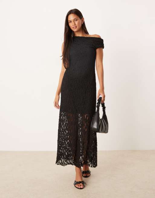 ASOS DESIGN – Czarna koronkowa sukienka midi z opadającym ramieniem