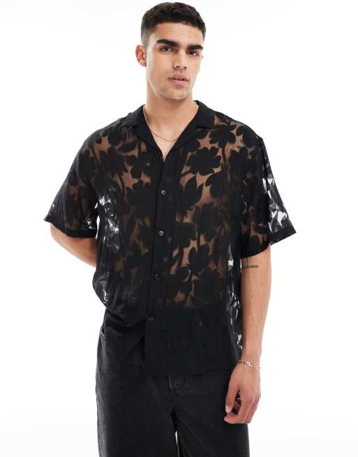 ASOS DESIGN – Czarna koszula oversize z kołnierzykiem kubańskim i kwiatowym wzorem devoré