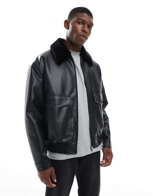 ASOS DESIGN – Czarna kurtka bomberka z imitacji skóry z kołnierzem ze sztucznego futra