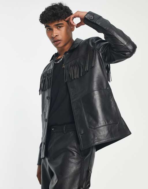 ASOS DESIGN – Czarna kurtka koszulowa z naturalnej skóry z frędzlami