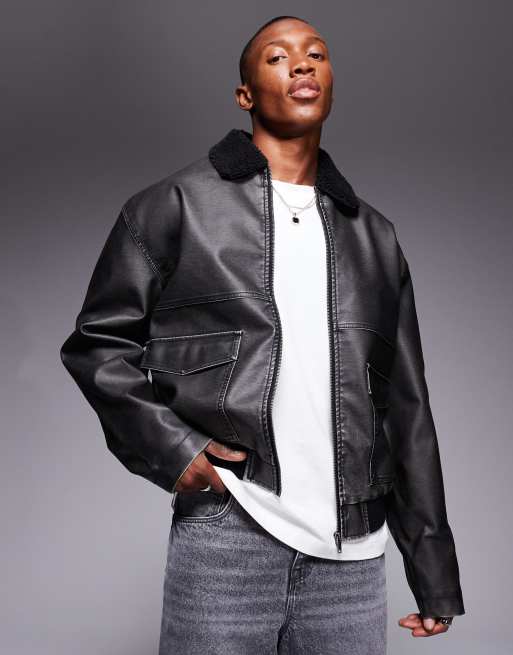 ASOS DESIGN – Czarna kurtka pilotka z imitacji skóry z przetarciami i kołnierzem z kożuszka