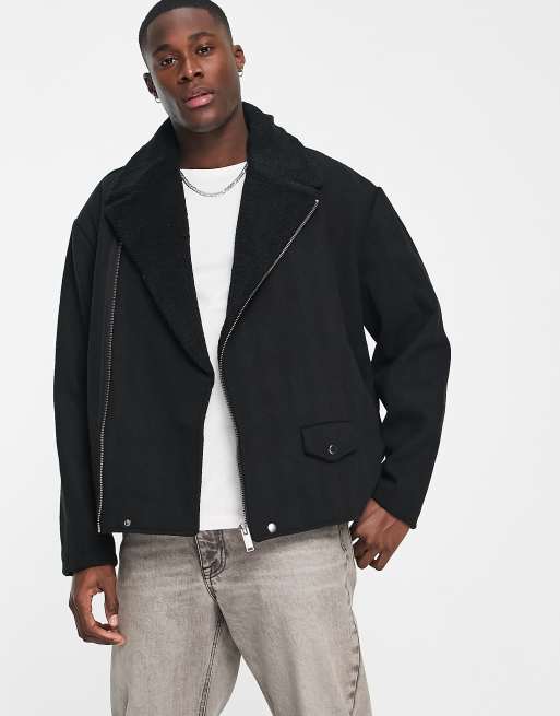 ASOS DESIGN – Czarna kurtka typu biker oversize z domieszką wełny z kołnierzem z kożuszka