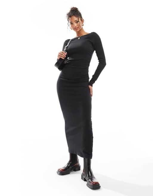 ASOS DESIGN – Czarna marszczona po bokach sukienka midi z długimi rękawami