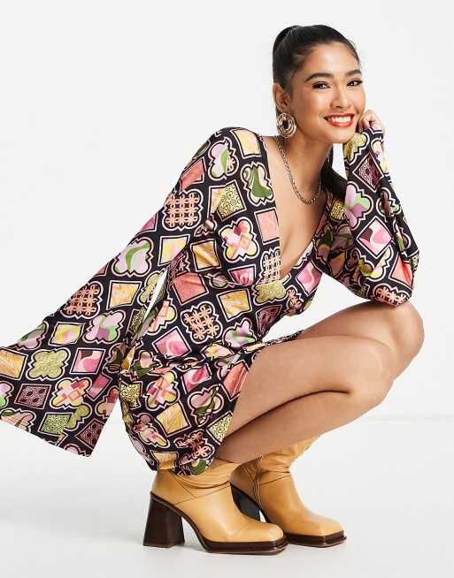 ASOS DESIGN – Czarna obcisła sukienka mini z rozkloszowanymi rękawami we wzór retro
