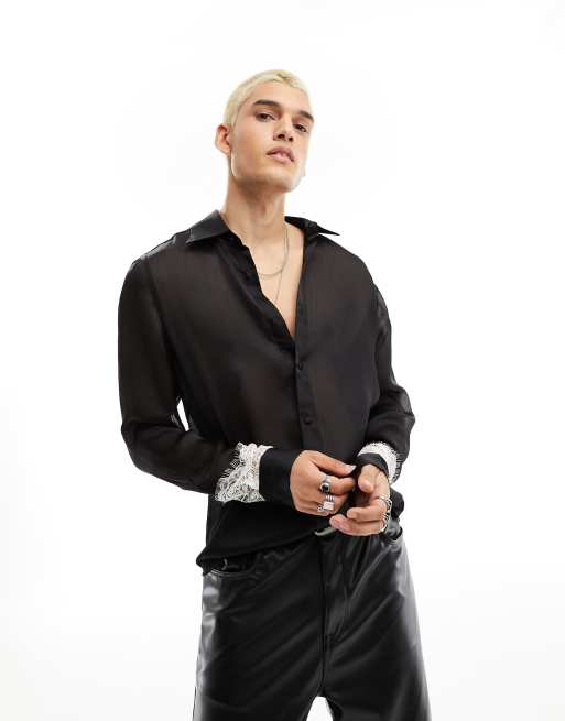 ASOS DESIGN – Czarna prześwitująca koszula o regularnym kroju z rękawami z koronką w kontrastowym kolorze