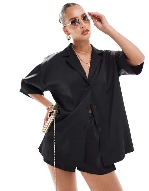 ASOS DESIGN – Czarna satynowa koszula z kołnierzykiem kubańskimi, część zestawu