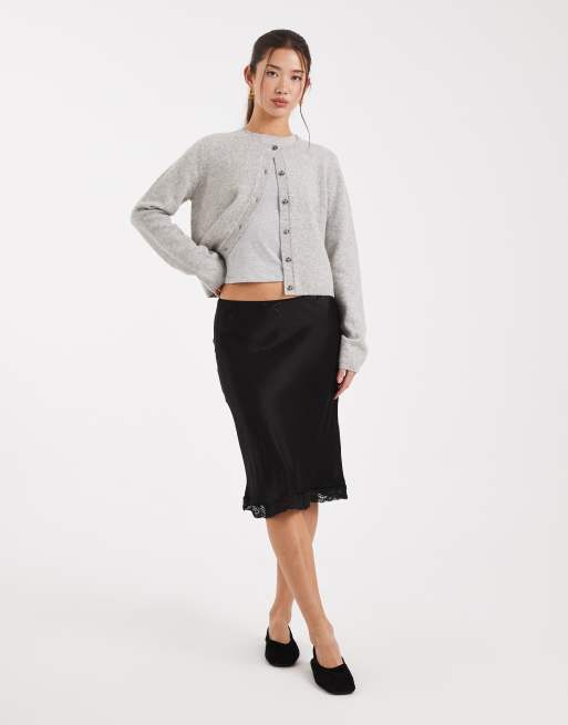 ASOS DESIGN – Czarna satynowa spódnica midi z koronkowym wykończeniem