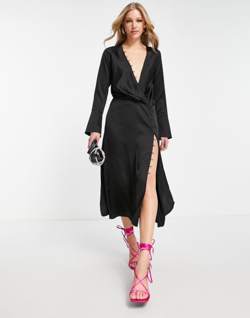 ASOS DESIGN – Czarna satynowa sukienka midi ze skośnym drapowaniem i ozdobnymi guzikami