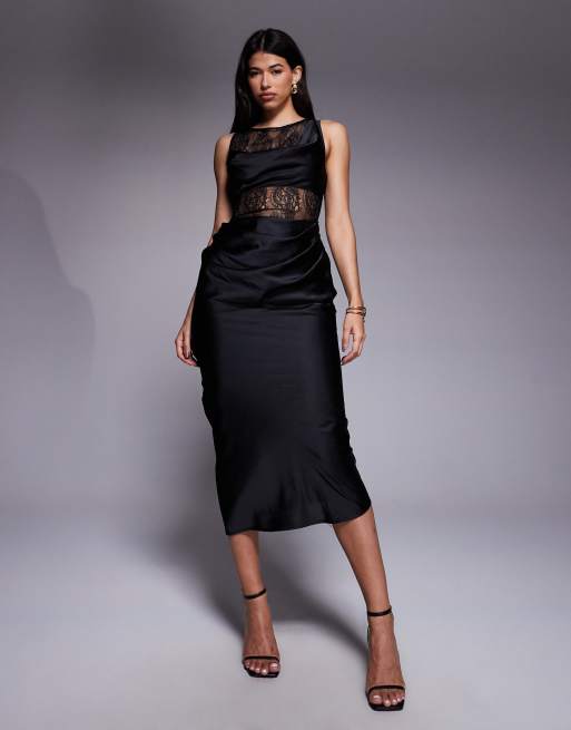 ASOS DESIGN – Czarna satynowo-koronkowa sukienka midi cięta ze skosu z drapowaniem