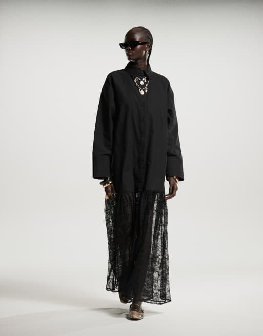 ASOS DESIGN – Czarna sukienka koszulowa maxi 2 w 1 z koronkową spódnicą
