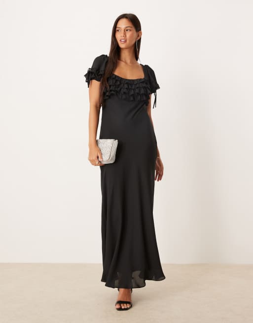 ASOS DESIGN – Czarna sukienka maxi na ramiączkach z falbankami na biuście