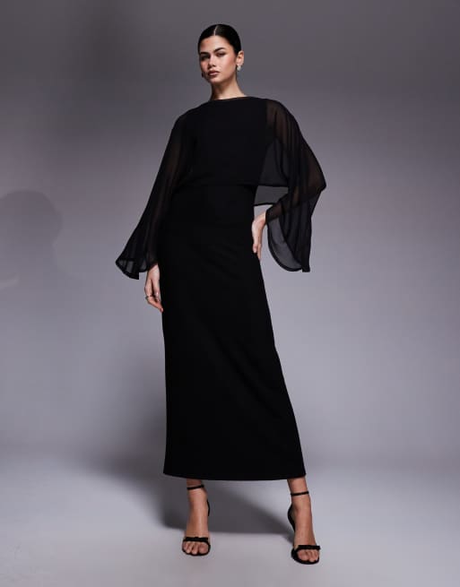 ASOS DESIGN – Czarna sukienka maxi z asymetrycznymi rękawami i szyfonową narzutką