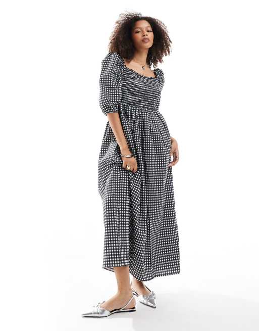 ASOS DESIGN – Czarna sukienka maxi z bufkami w kratkę vichy