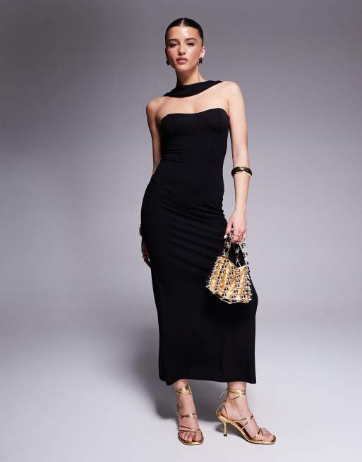 ASOS DESIGN – Czarna sukienka maxi z dekoltem w kształcie serca bandeau z imitacją szalika
