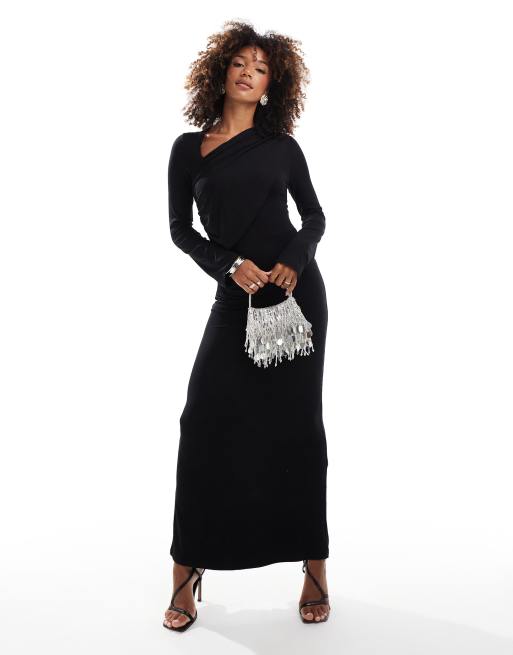ASOS DESIGN – Czarna sukienka maxi z długimi rękawami i marszczoną wstawką