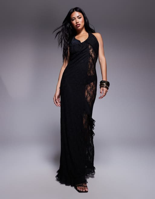 ASOS DESIGN – Czarna sukienka maxi z koronkowymi wstawkami, asymetrycznymi falbankami i szwami