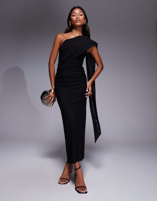 ASOS DESIGN – Czarna sukienka maxi z siateczki z dekoltem bandeau i szalikiem