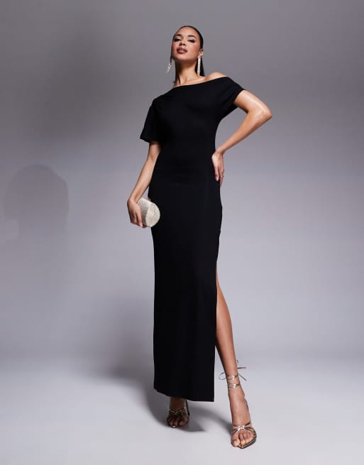 ASOS DESIGN – Czarna sukienka midi z asymetrycznymi krótkimi rękawami i rozcięciem