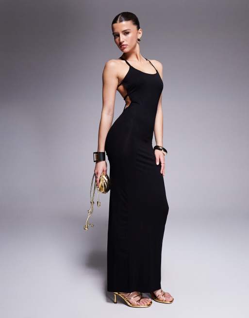 ASOS DESIGN – Czarna sukienka midi z dekoltem karo, odkrytymi plecami i paseczkami na plecach
