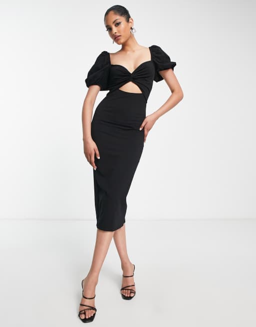 ASOS DESIGN – Czarna sukienka midi z wycięciem i bufkami