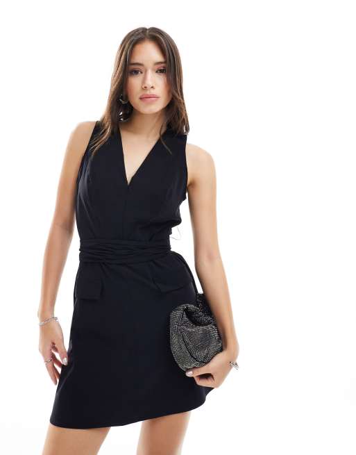 ASOS DESIGN – Czarna sukienka mini bez rękawów z głębokim dekoltem i wiązaniem