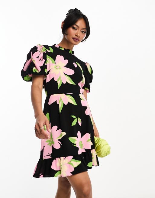 ASOS DESIGN – Czarna sukienka mini z bufkami i falowanym dekoltem w kwiatowy wzór