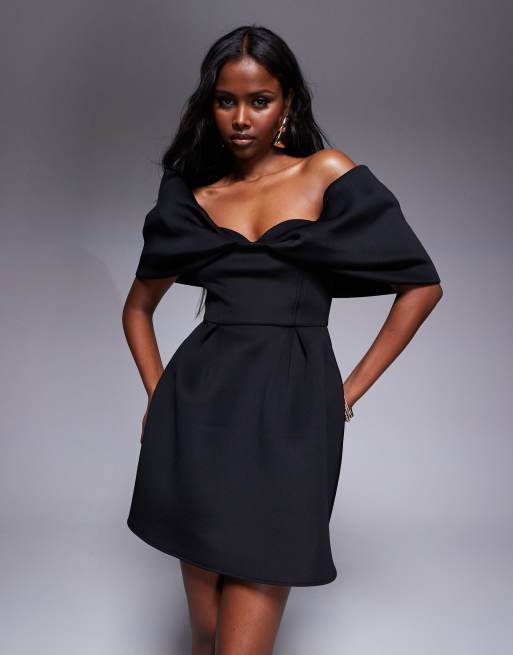 ASOS DESIGN – Czarna sukienka mini z materiału w stylu scuba z dekoltem bardot i pełną spódnicą
