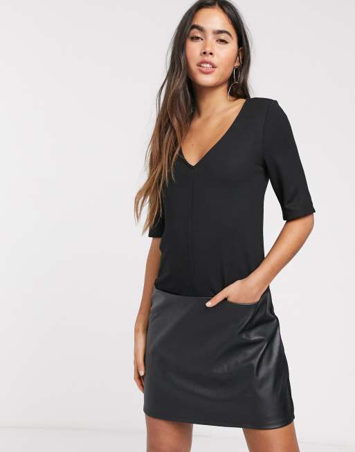 ASOS DESIGN – Czarna sukienka mini ze wstawką z imitacji skóry na dole