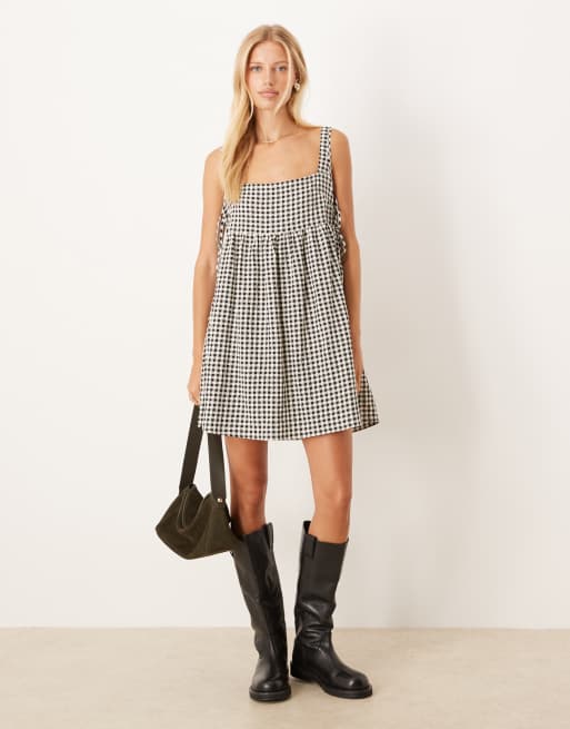 ASOS DESIGN – Czarna wiązana po bokach sukienka mini w stylu babydoll w kratkę vichy