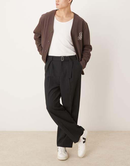 ASOS DESIGN – Czarne eleganckie spodnie z szerokimi nogawkami, paskiem i zakładkami z przodu