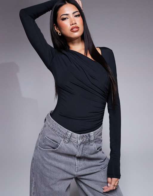 ASOS DESIGN – Czarne opinające body z asymetrycznym dekoltem i drapowaniem