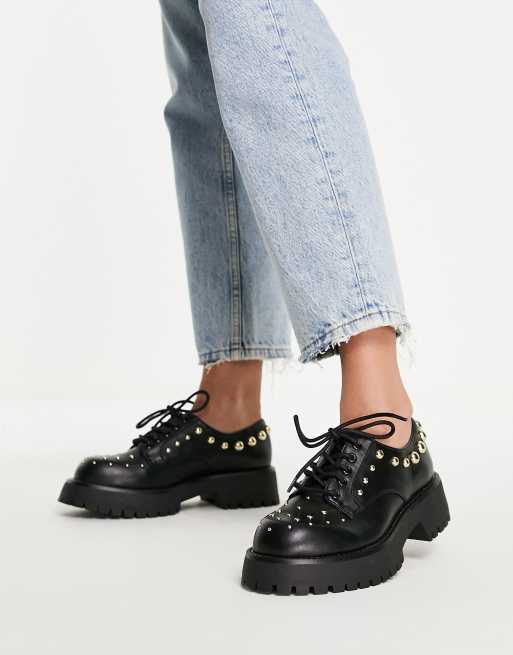 ASOS DESIGN – Czarne sznurowane płaskie buty z ćwiekami na grubej podeszwie