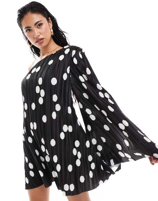 ASOS DESIGN – Czarno-biała plisowana sukienka mini na jedno ramię we wzór w groszki