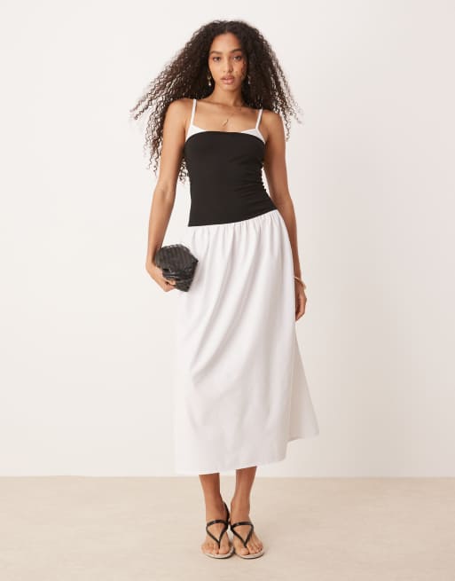 ASOS DESIGN – Czarno-biała zbierana sukienka maxi z popelinową wstawką